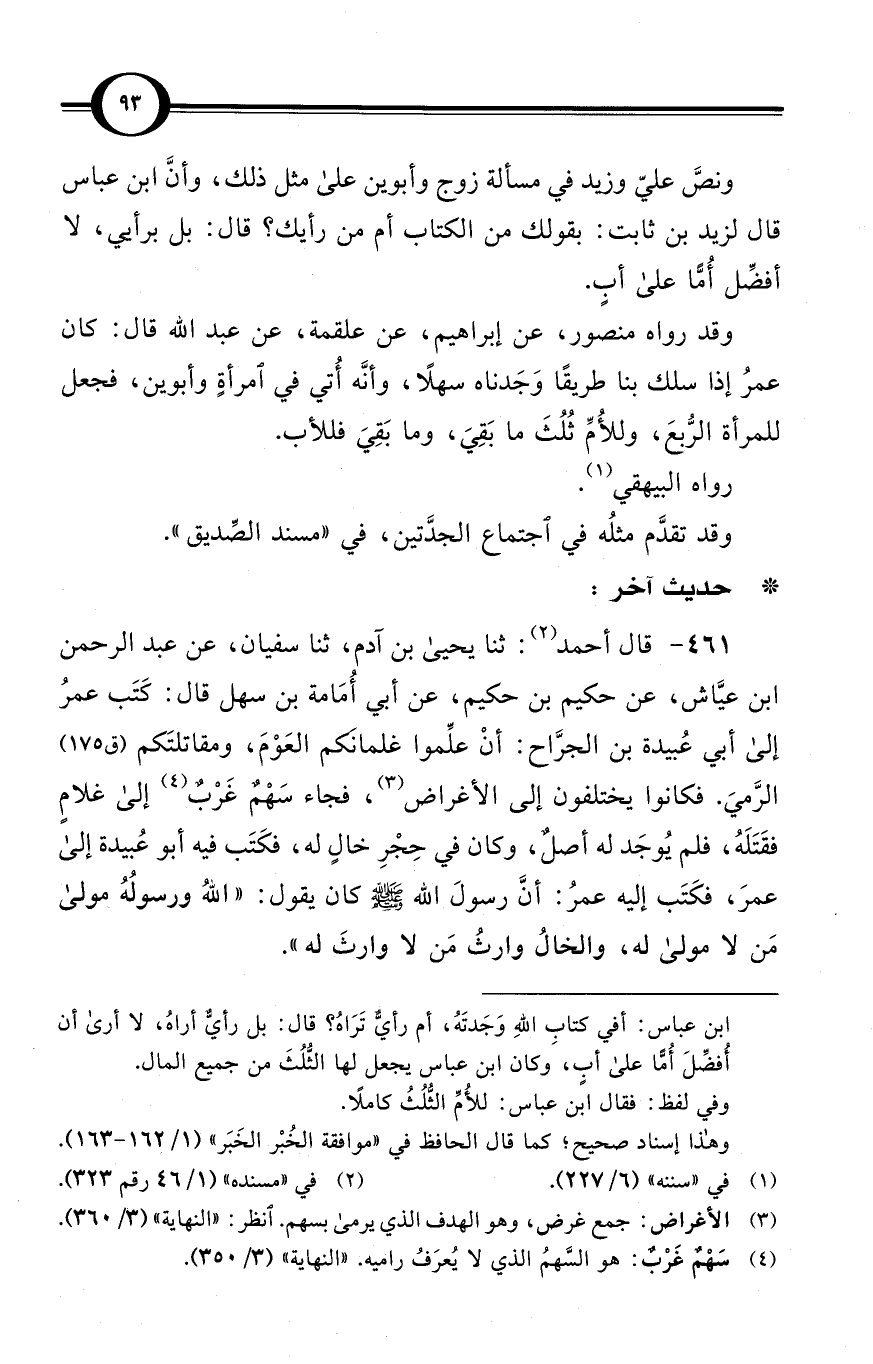 (461) قال أحمد (¬2): ثنا يحيى بن آدم، ثنا سفيان، عن عبد الرحمن بن عيَّاش، عن حكيم بن حكيم، عن أبي أُمَامة بن سهل قال: كَتَب عمرُ إلى أبي عُبيدة بن الجرَّاح: أنْ علِّموا غلمانَكم العَوْمَ، ومقاتلتَكم / (ق 175) الرَّميَ. فكانوا يختلفون إلى الأغراض (¬3)، فجاء سَهْمٌ غَرْبٌ (¬4) إلى غلامٍ فقَتَلَهُ، فلم يُوجَد له أصلٌ، وكان في حِجْرِ خالٍ له، فكَتَب فيه أبو عُبيدة إلى عمرَ، فكَتَب إليه عمرُ: أنَّ رسولَ الله صلى الله عليه وسلم كان يقول: «اللهُ ورسولُهُ مولى مَن لا مولى له، والخالُ وارثُ مَن لا وارثَ له».