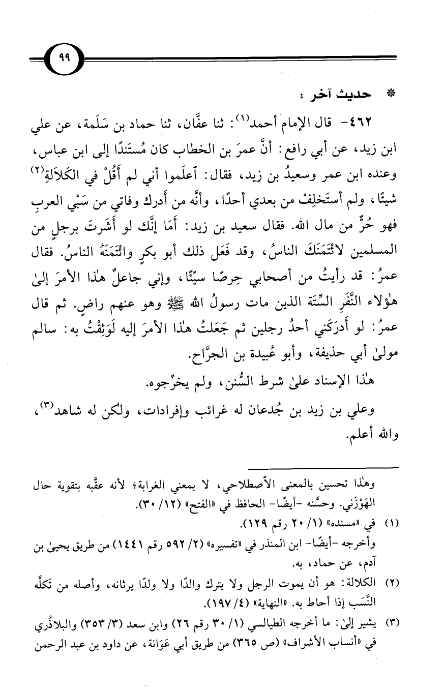 (462) قال الإمام أحمد (¬1): ثنا عفَّان، ثنا حماد بن سَلَمة، عن علي بن زيد، عن أبي رافع: أنَّ عمرَ بن الخطاب كان مُستَندًا إلى ابن عباس، وعنده ابنُ عمر وسعيدُ بن زيد، فقال: اعلَموا أني لم أَقُلْ في الكَلاَلةِ (¬2) شيئًا، ولم أستَخلِفْ من بعدي أحدًا، وأنَّه من أَدرك وفاتي من سَبْي العربِ فهو حُرٌّ من مال الله. فقال سعيد بن زيد: أَمَا إنَّك لو أَشَرتَ برجلٍ من المسلمين لائْتَمَنَكَ الناسُ، وقد فَعَل ذلك أبو بكرٍ وائْتَمَنَهُ الناسُ. فقال عمرُ: قد رأيتُ من أصحابي حِرصًا سيّئًا، وإني جاعلٌ هذا الأمرَ إلى هؤلاء النَّفَرِ السِّتَة الذين مات رسولُ الله صلى الله عليه وسلم وهو عنهم راضٍ. ثم قال عمرُ: لو أَدرَكَني أحدُ رجلين ثم جَعَلتُ هذا الأمرَ إليه لَوَثِقْتُ به: سالم مولى أبي حذيفة، وأبو عُبيدة بن الجرَّاح.