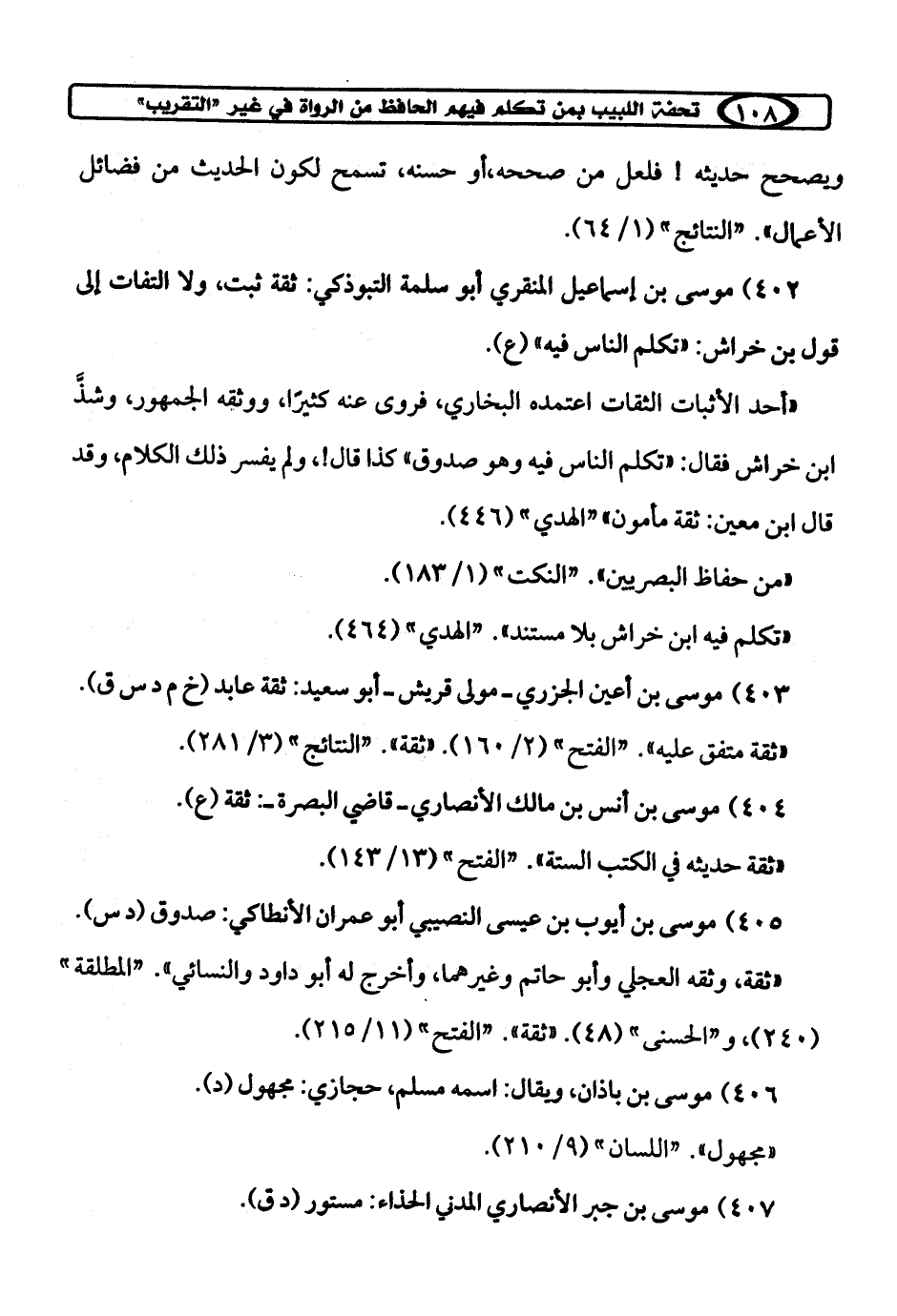 402) موسى بن إسماعيل المنقري أبو سلمة التبوذكي: ثقة ثبت، ولا التفات إلى قول بن خراش: "تكلم الناس فيه" (ع).