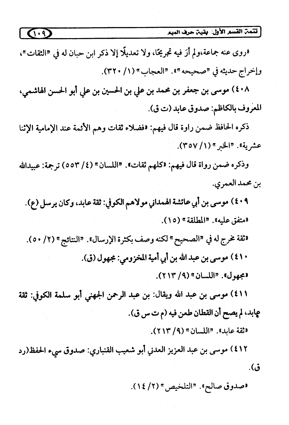 408) موسى بن جعفر بن محمد بن علي بن الحسين بن علي أبو الحسن الهاشمي، المعروف بالكاظم: صدوق عابد (ت ق).