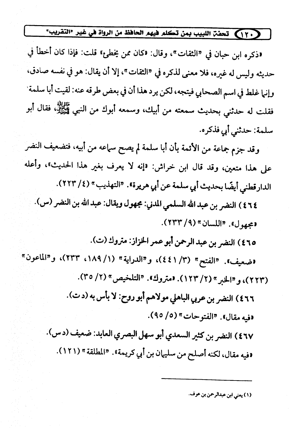 464) النضر بن عبد الله السلمي المدني: مجهول ويقال: عبد الله بن النضر (س).