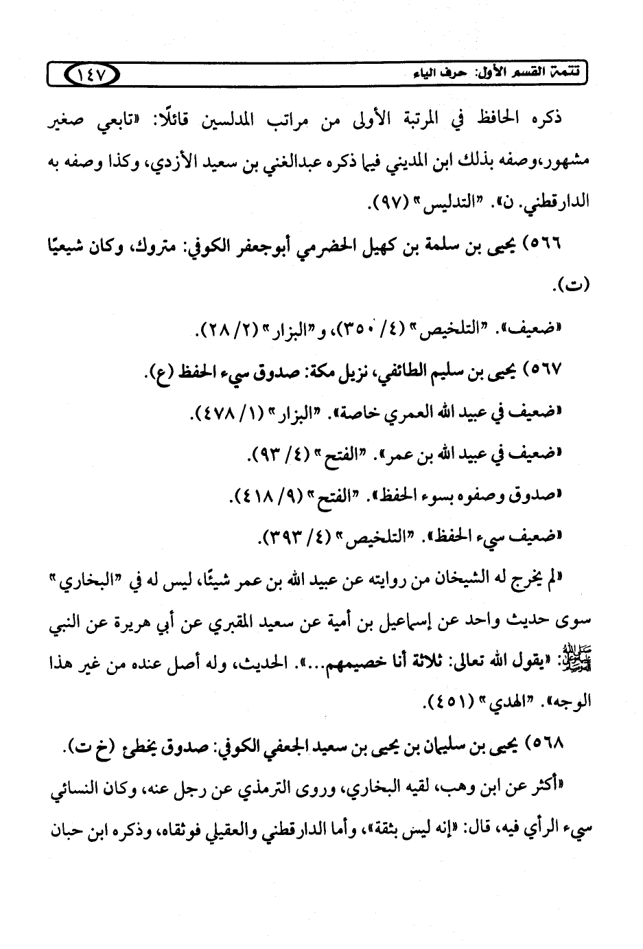 566) يحيى بن سلمة بن كهيل الحضرمي أبو جعفر الكوفي: متروك، وكان شيعيًا (ت).