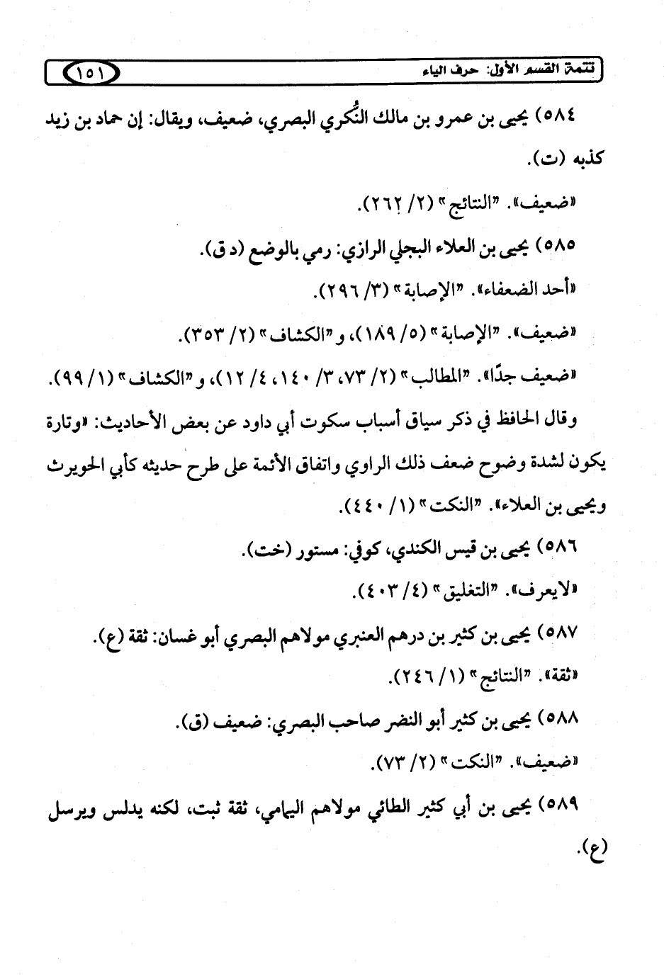 584) يحيى بن عمرو بن مالك النُّكري البصري، ضعيف، ويقال: إن حماد بن زيد كذبه (ت).