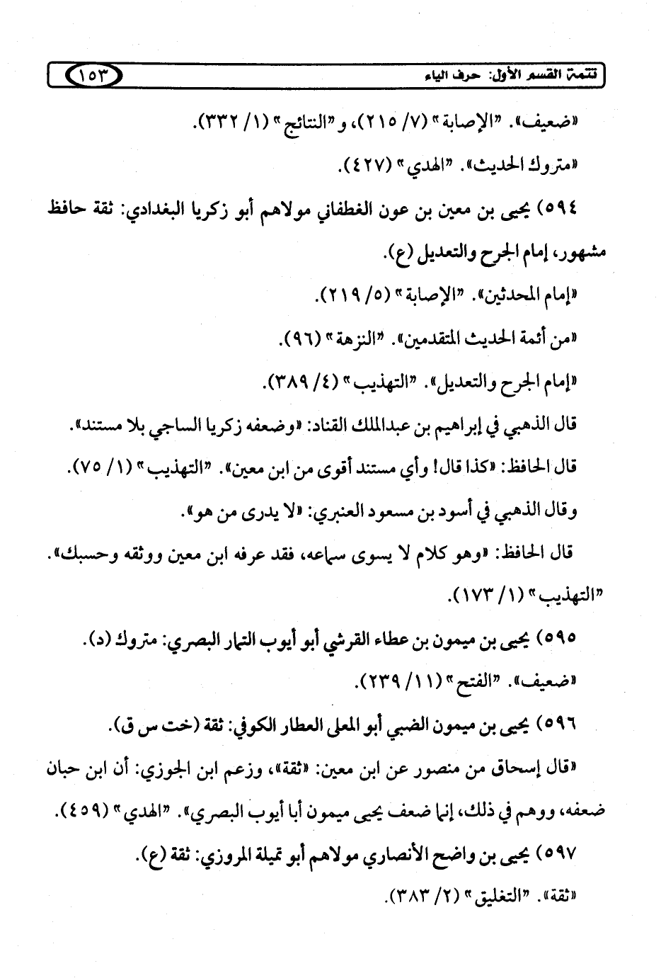 594) يحيى بن معين بن عون الغطفاني مولاهم أبو زكريا البغدادي: ثقة حافظ مشهور، إمام الجرح والتعديل (ع).