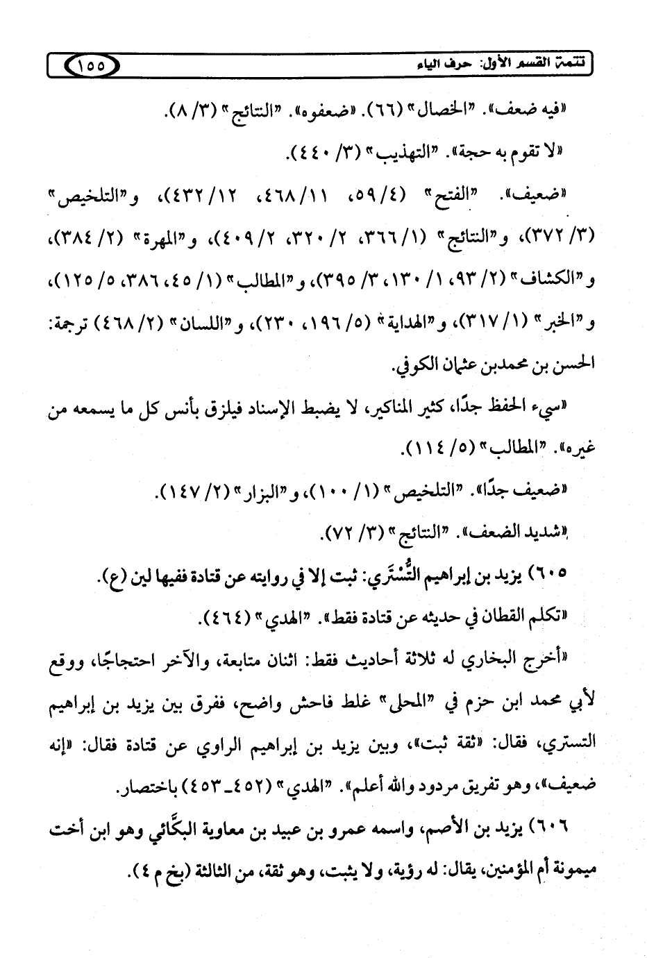 605) يزيد بن إبراهيم التُّسْتَري: ثبت إلا في روايته عن قتادة ففيها لين (ع).