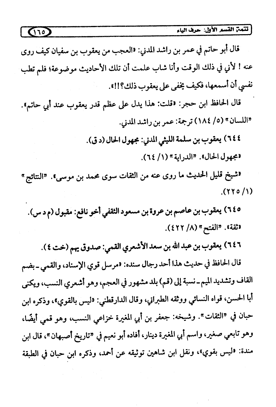 قال الحافظ ابن حجر: "قلت: هذا يدل على عظم قدر يعقوب عند أبي حاتم". "اللسان" (5/ 184) ترجمة: عمر بن راشد المدني.