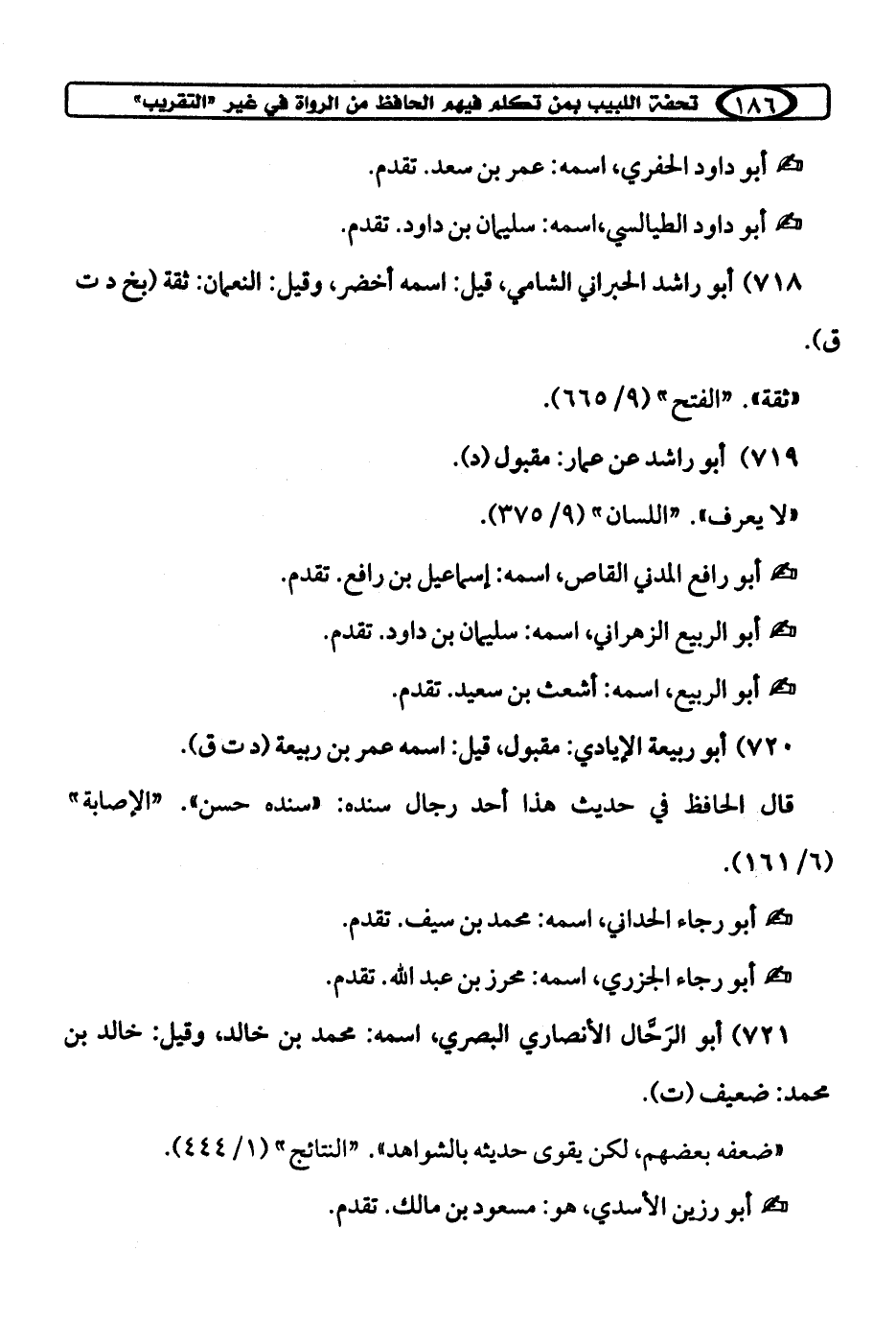 718) أبو راشد الحبراني الشامي، قيل: اسمه أخضر، وقيل: النعمان: ثقة (بخ د ت ق).