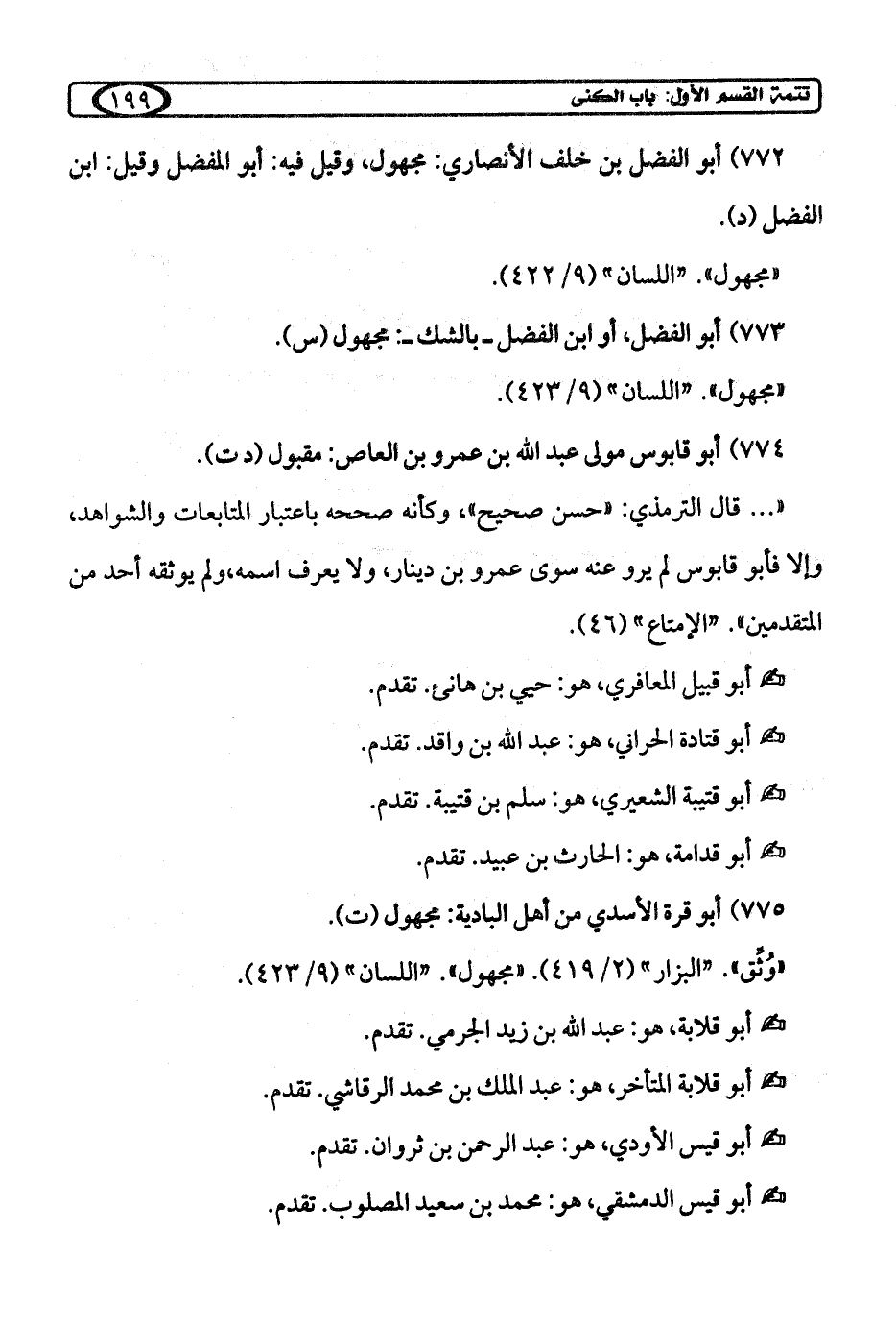 " ... قال الترمذي: "حسن صحيح"، وكأنه صححه باعتبار المتابعات والشواهد، وإلا فأبو قابوس لم يرو عنه سوى عمرو بن دينار، ولا يعرف اسمه، ولم يوثقه أحد من المتقدمين". "الإمتاع" (46).