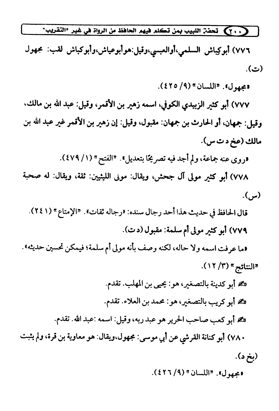 777) أبو كثير الزبيدي الكوفي، اسمه زهير بن الأقمر، وقيل: عبد الله بن مالك، وقيل: جمهان، أو الحارث بن جمهان: مقبول، وقيل: إن زهير بن الأقمر غير عبد الله بن مالك (عخ د ت س).