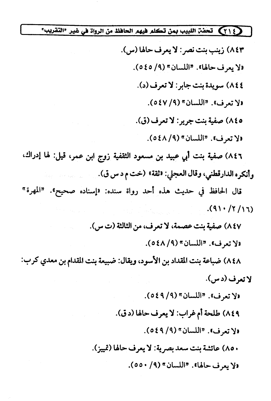 846) صفية بنت أبي عبيد بن مسعود الثقفية زوج ابن عمر، قيل: لها إدراك، وأنكره الدارقطني، وقال العجلي: "ثقة" (خت م د س ق).