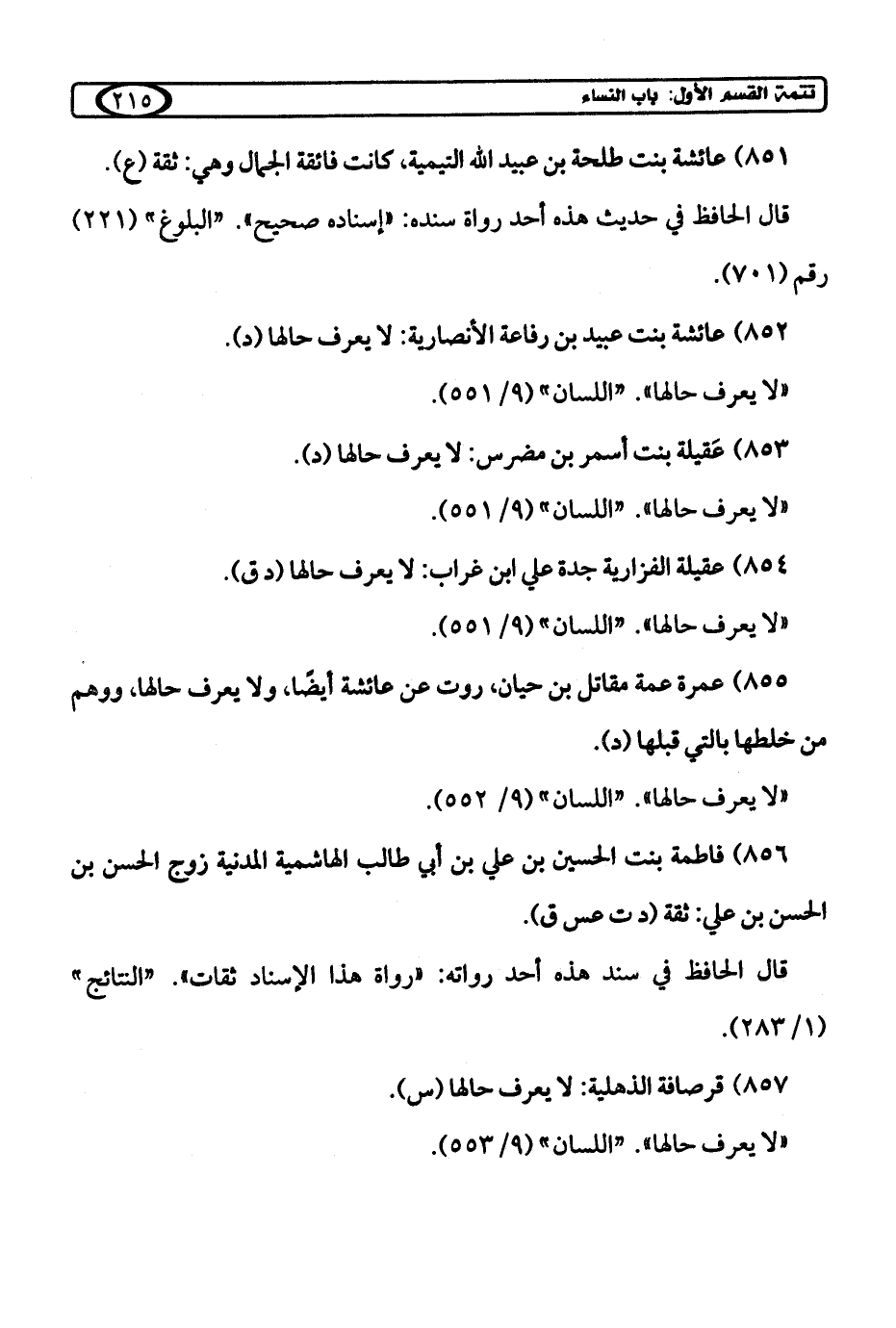 851) عائشة بنت طلحة بن عبيد الله التيمية، كانت فائقة الجمال وهي: ثقة (ع).