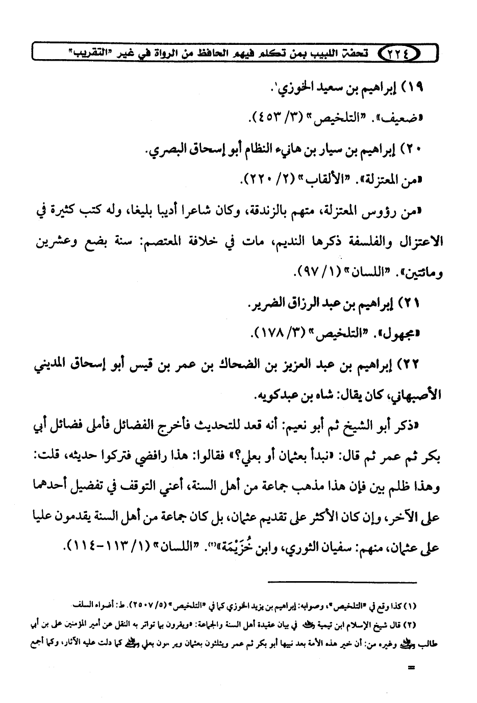 "ذكر أبو الشيخ ثم أبو نعيم: أنه قعد للتحديث فأخرج الفضائل فأملى فضائل أبي بكر ثم عمر ثم قال: "نبدأ بعثمان أو بعلي؟ " فقالوا: هذا رافضي فتركوا حديثه، قلت: وهذا ظلم بين فإن هذا مذهب جماعة من أهل السنة، أعني التوقف في تفضيل أحدهما على الآخر، وإن كان الأكثر على تقديم عثمان، بل كان جماعة من أهل السنة يقدمون عليا على عثمان، منهم: سفيان الثوري، وابن خُزَيْمَة" (¬2) "اللسان" (1/ 113 - 114).