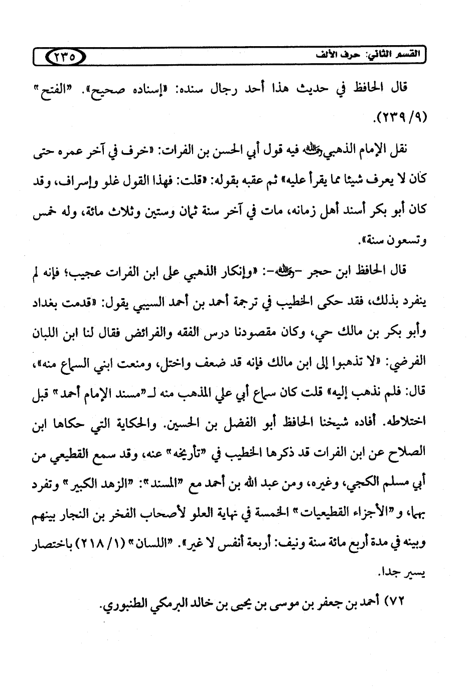 قال الحافظ ابن حجر -رحمه الله-: "وإنكار الذهبي على ابن الفرات عجيب؛ فإنه لم ينفرد بذلك، فقد حكى الخطيب في ترجمة أحمد بن أحمد السيبي يقول: "قدمت بغداد وأبو بكر بن مالك حي، وكان مقصودنا درس الفقه والفرائض فقال لنا ابن اللبان الفرضي: "لا تذهبوا إلى ابن مالك فإنه قد ضعف واختل، ومنعت ابني السماع منه"، قال: فلم نذهب إليه" قلت كان سماع أبي علي المذهب منه لـ "مسند الإمام أحمد" قبل اختلاطه. أفاده شيخنا الحافظ أبو الفضل بن الحسين. والحكاية التي حكاها ابن الصلاح عن ابن الفرات قد ذكرها الخطيب في "تأريخه" عنه، وقد سمع القطيعي من أبي مسلم الكجي، وغيره، ومن عبد الله بن أحمد مع "المسند": "الزهد الكبير" وتفرد بهما، و"الأجزاء القطيعيات" الخمسة في نهاية العلو لأصحاب الفخر بن النجار بينهم وبينه في مدة أربع مائة سنة ونيف: أربعة أنفس لا غير". "اللسان" (1/ 218) باختصار يسير جدا.