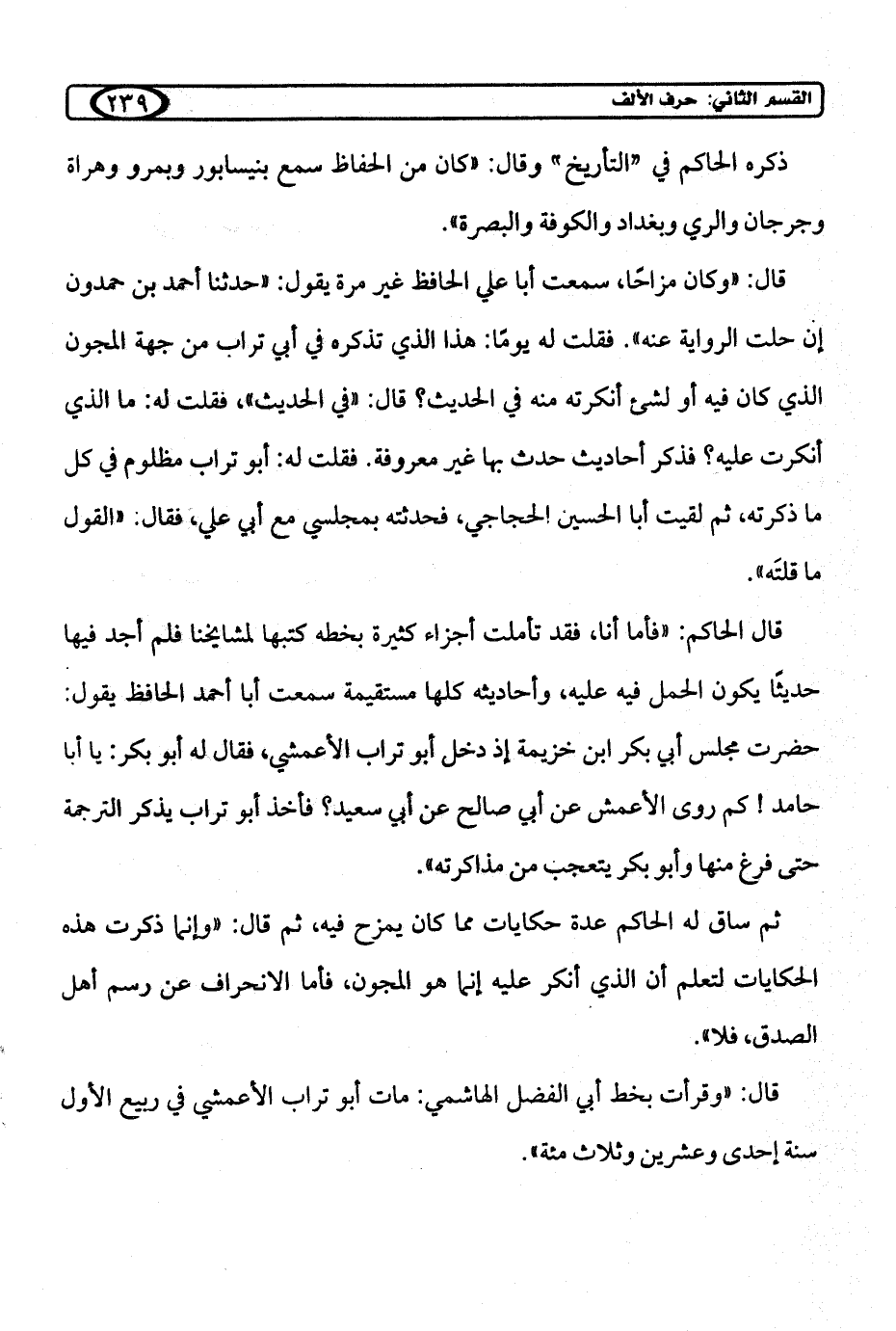قال: "وكان مزاحًا، سمعت أبا علي الحافظ غير مرة يقول: "حدثنا أحمد بن حمدون إن حلت الرواية عنه". فقلت له يومًا: هذا الذي تذكره في أبي تراب من جهة المجون الذي كان فيه أو لشئ أنكرته منه في الحديث؟ قال: "في الحديث"، فقلت له: ما الذي أنكرت عليه؟ فذكر أحاديث حدث بها غير معروفة. فقلت له: أبو تراب مظلوم في كل ما ذكرته، ثم لقيت أبا الحسين الحجاجي، فحدثته بمجلسي مع أبي علي، فقال: "القول ما قلتَه".