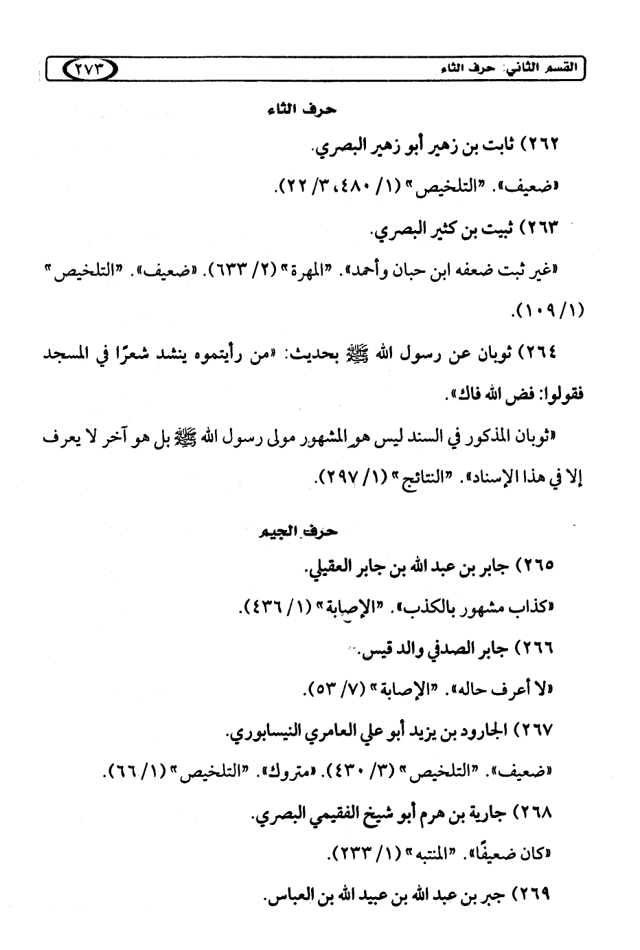 264) ثوبان عن رسول الله - صلى الله عليه وسلم - بحديث: " من رأيتموه ينشد شعرًا في المسجد فقولوا: فض الله فاك".