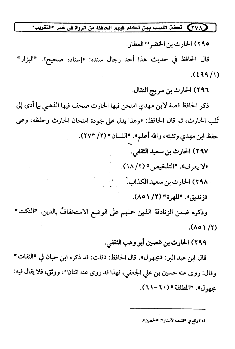 ذكر الحافظ قصة لابن مهدي امتحن فيها الحارث صحف فيها الذهبي بما أدى إلى ثَلب الحارث، ثم قال الحافظ: "وهذا يدل على جودة امتحان الحارث وحفظه، وعلى حفظ ابن مهدي وتثبته، والله أعلم". "اللسان" (2/ 273).
