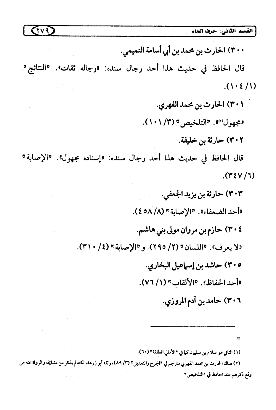 (¬2) هناك الحارث بن محمد الفهري مترجم في "الجرح والتعديل" (3/ 89)، وثقه أبو زرعة، لكنه لم يذكر من مشايخه والرواة عنه من وقع ذكرهم عند الحافظ في "التلخيص".