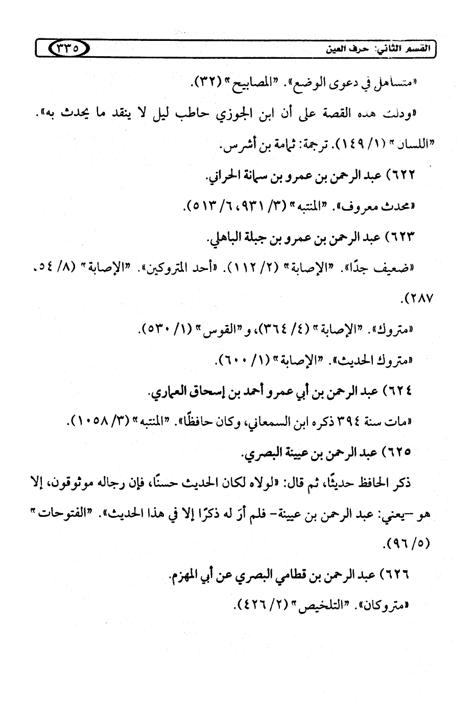 " ضعيف جدًا". "الإصابة" (2/ 112). "أحد المتروكين". "الإصابة" (8/ 54، 287).