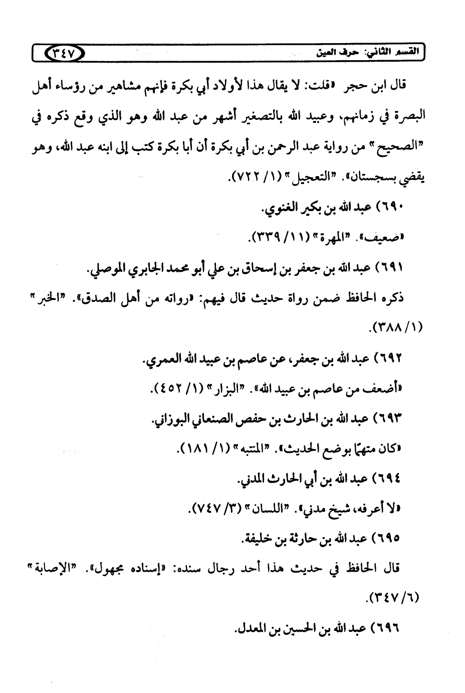 قال ابن حجر: "قلت: لا يقال هذا لأولاد أبي بكرة فإنهم مشاهير من رؤساء أهل البصرة في زمانهم، وعبيد الله بالتصغير أشهر من عبد الله وهو الذي وقع ذكره في "الصحيح" من رواية عبد الرحمن بن أبي بكرة أن أبا بكرة كتب إلى ابنه عبد الله، وهو يقضي بسجستان". "التعجيل" (1/ 722).