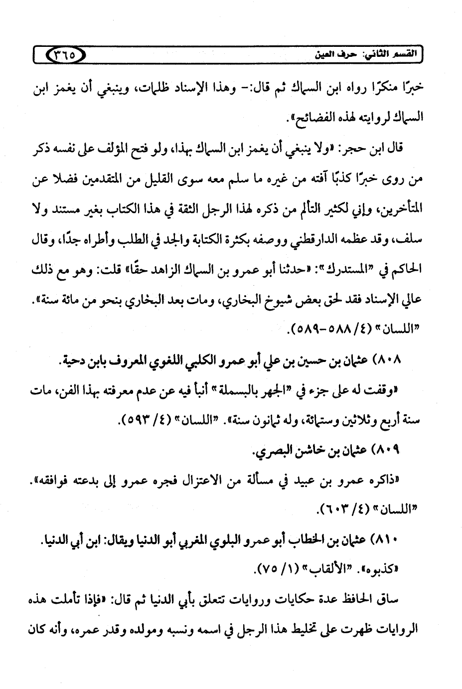 قال ابن حجر: "ولا ينبغي أن يغمز ابن السماك بهذا، ولو فتح المؤلف على نفسه ذكر من روى خبرًا كذبًا آفته من غيره ما سلم معه سوى القليل من المتقدمين فضلا عن المتأخرين، وإني لكثير التألم من ذكره لهذا الرجل الثقة في هذا الكتاب بغير مستند ولا سلف، وقد عظمه الدارقطني ووصفه بكثرة الكتابة والجد في الطلب وأطراه جدًا، وقال الحاكم في "المستدرك": "حدثنا أبو عمرو بن السماك الزاهد حقًا" قلت: وهو مع ذلك عالي الإسناد فقد لحق بعض شيوخ البخاري، ومات بعد البخاري بنحو من مائة سنة". "اللسان" (4/ 588 - 589).