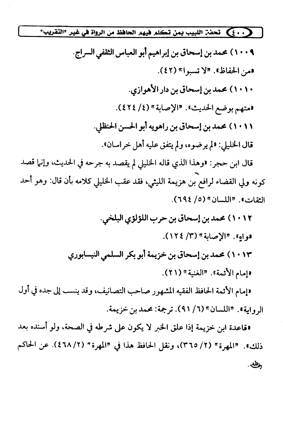 "إمام الأئمة الحافظ الفقيه المشهور صاحب التصانيف، وقد ينسب إلى جده في أول الرواية". "اللسان" (6/ 91). ترجمة: محمد بن خزيمة.