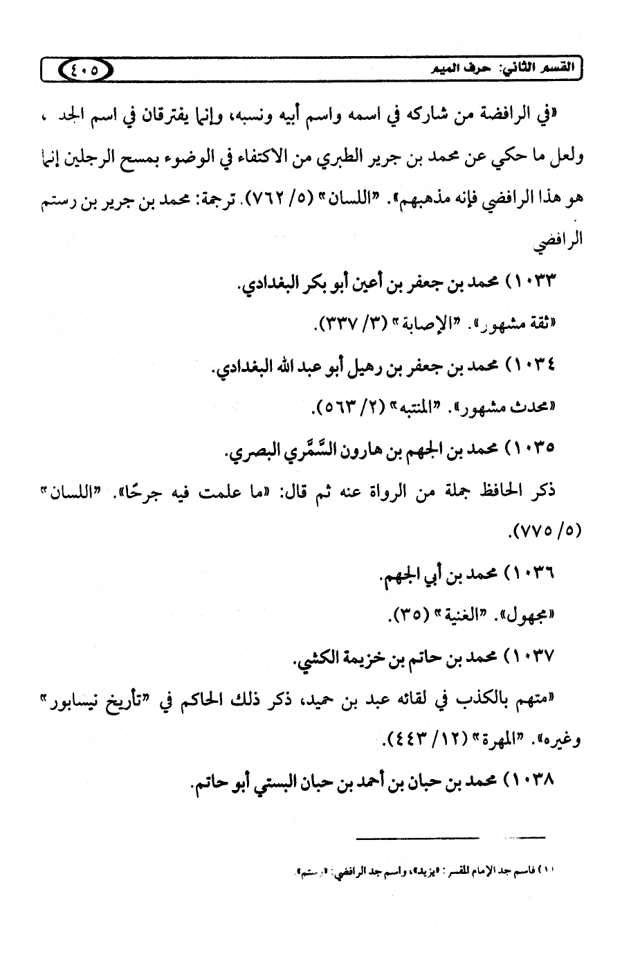 "في الرافضة من شاركه في اسمه واسم أبيه ونسبه، وإنما يفترقان في اسم الجد، ولعل ما حكي عن محمد بن جرير الطبري من الاكتفاء في الوضوء بمسح الرجلين إنما هو هذا الرافضي فإنه مذهبهم". "اللسان" (5/ 762). ترجمة: محمد بن جرير بن رستم الرافضي (¬1).