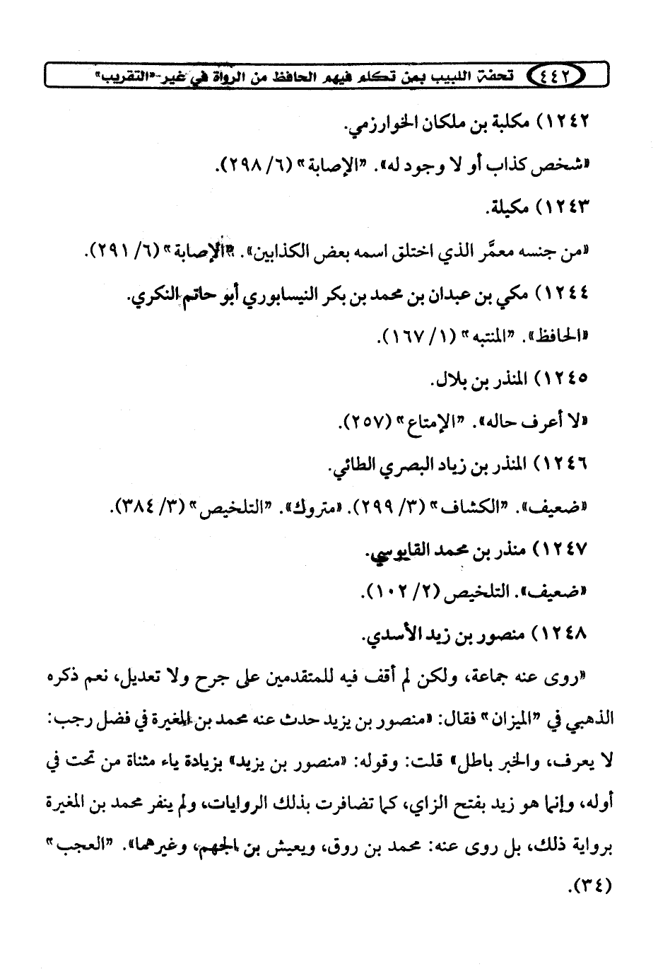 " روى عنه جماعة، ولكن لم أقف فيه للمتقدمين على جرح ولا تعديل، نعم ذكره الذهبي في "الميزان" فقال: "منصور بن يزيد حدث عنه محمد بن المغيرة في فضل رجب: لا يعرف، والخبر باطل" قلت: وقوله: "منصور بن يزيد" بزيادة ياء مثناة من تحت في أوله، وإنما هو زيد بفتح الزاي، كما تضافرت بذلك الروايات، ولم ينفر محمد بن المغيرة برواية ذلك، بل روى عنه: محمد بن روق، ويعيش بن الجهم، وغيرهما". "العجب" (34).