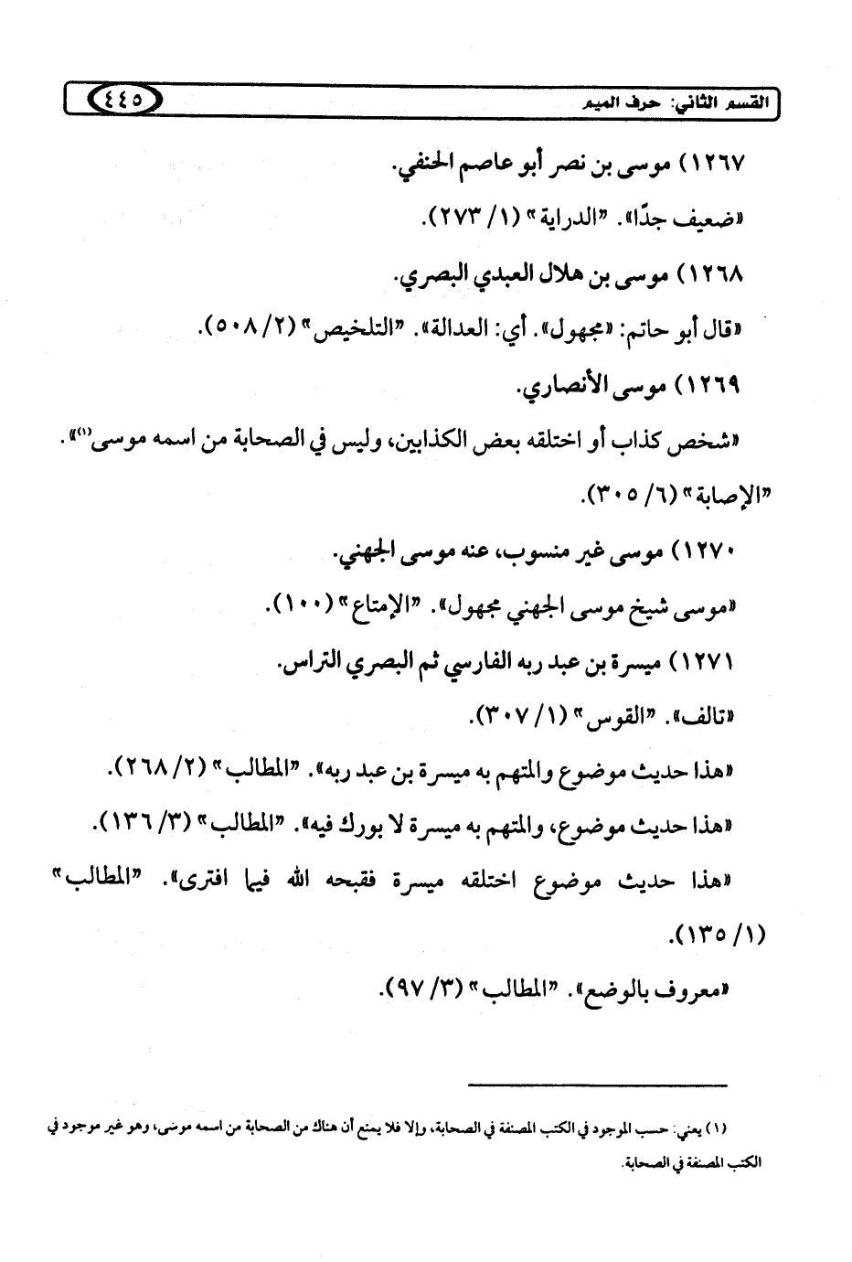 (¬1) يعني: حسب الموجود في الكتب المصنفة في الصحابة، وإلا فلا يمنع أن هناك من الصحابة من اسمه موسى، وهر غير موجود في الكتب المصنفة في الصحابة.