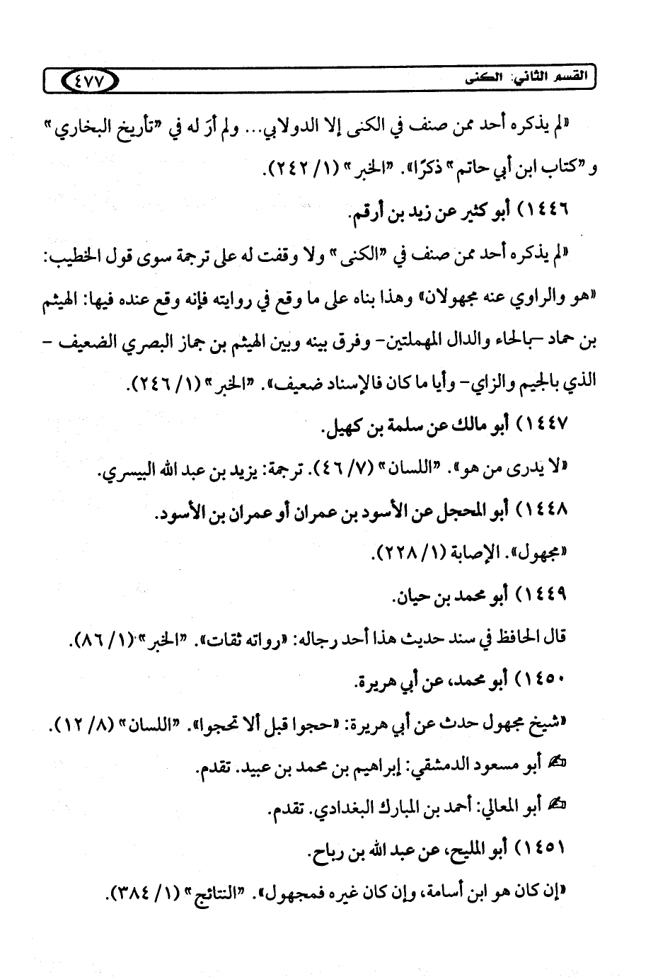 "لم يذكره أحد ممن صنف في الكنى إلا الدولابي ... ولم أرَ له في "تأريخ البخاري" و"كتاب ابن أبي حاتم" ذكرًا". "الخبر" (1/ 242).
