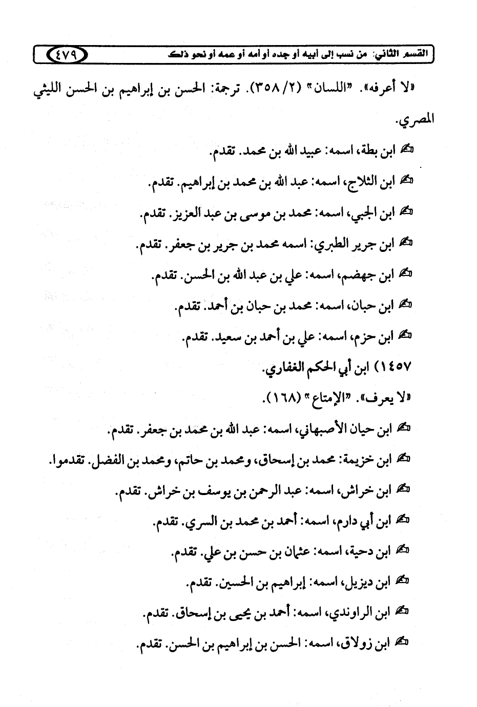 "لا أعرفه". "اللسان" (2/ 358). ترجمة: الحسن بن إبراهيم بن الحسن الليثي المصري.
