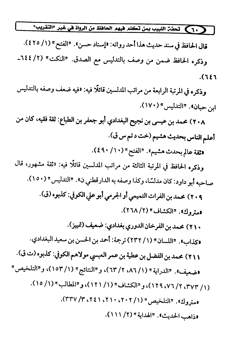 208) محمد بن عيسى بن نجيح البغدادي أبو جعفر بن الطباع: ثقة فقيه، كان من أعلم الناس بحديث هشيم (خت د تم س ق).
