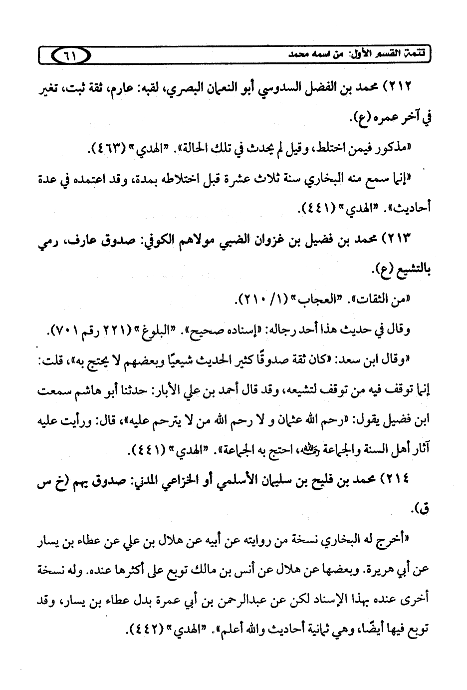212) محمد بن الفضل السدوسي أبو النعمان البصري، لقبه: عارم، ثقة ثبت، تغير في آخر عمره (ع).