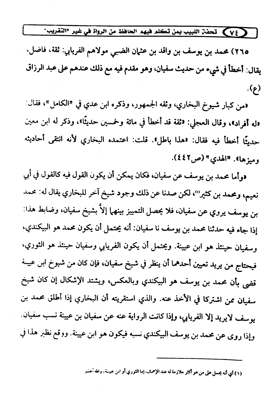 265) محمد بن يوسف بن واقد بن عثمان الضبي مولاهم الفريابي: ثقة، فاضل، يقال: أخطأ في شيء من حديث سفيان، وهو مقدم فيه مع ذلك عندهم على عبد الرزاق (ع).
