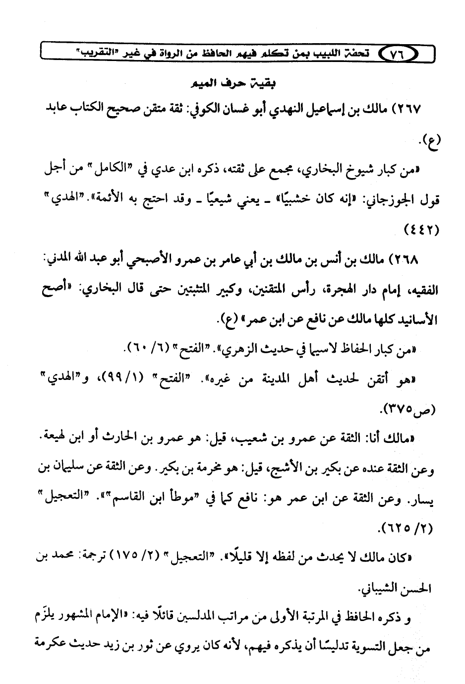 267) مالك بن إسماعيل النهدي أبو غسان الكوفي: ثقة متقن صحيح الكتاب عابد (ع).