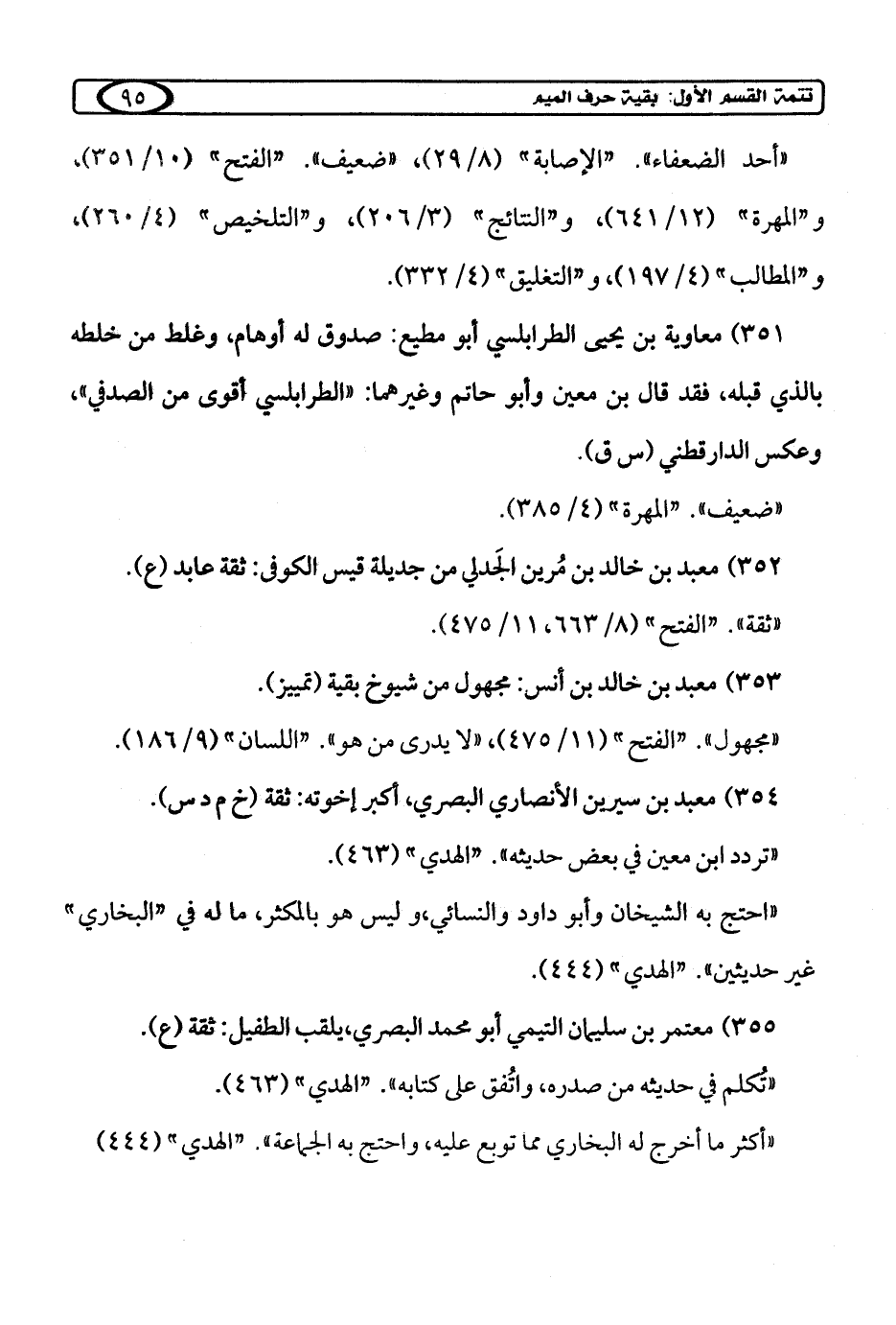 351) معاوية بن يحيى الطرابلسي أَبو مطيع: صدوق له أوهام، وغلط من خلطه بالذي قبله، فقد قال بن معين وأَبو حاتم وغيرهما: "الطرابلسي أقوى من الصدفي"، وعكس الدارقطني (س ق).
