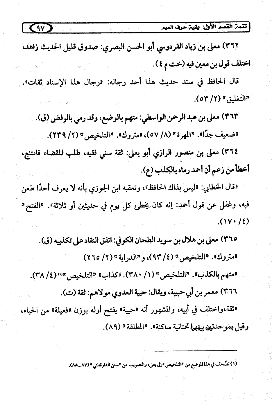 362) معلى بن زياد القردوسي أَبو الحسن البصري: صدوق قليل الحديث زاهد، اختلف قول بن معين فيه (خت م 4).