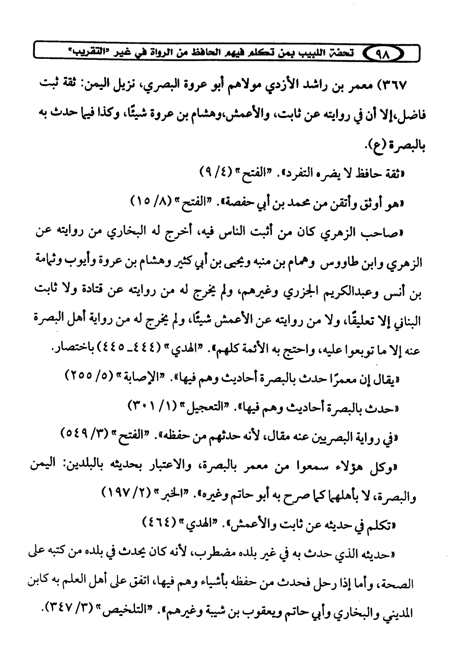 367) معمر بن راشد الأزدي مولاهم أبو عروة البصري، نزيل اليمن: ثقة ثبت فاضل، إلا أن في روايته عن ثابت، والأعمش، وهشام بن عروة شيئًا، وكذا فيما حدث به بالبصرة (ع).