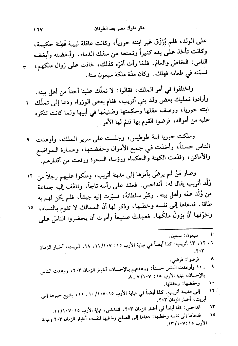 وملكت حوريا ابنة طوطيس، وجلست على سرير الملك، وأوعدت الناس حسنا، وأخذت في جمع الأموال وحفضتها، وعمارة المواضع والأماكن، وقدّمت الكهنة والحكماء ورؤساء السحرة ورفعت من أقدارهم.