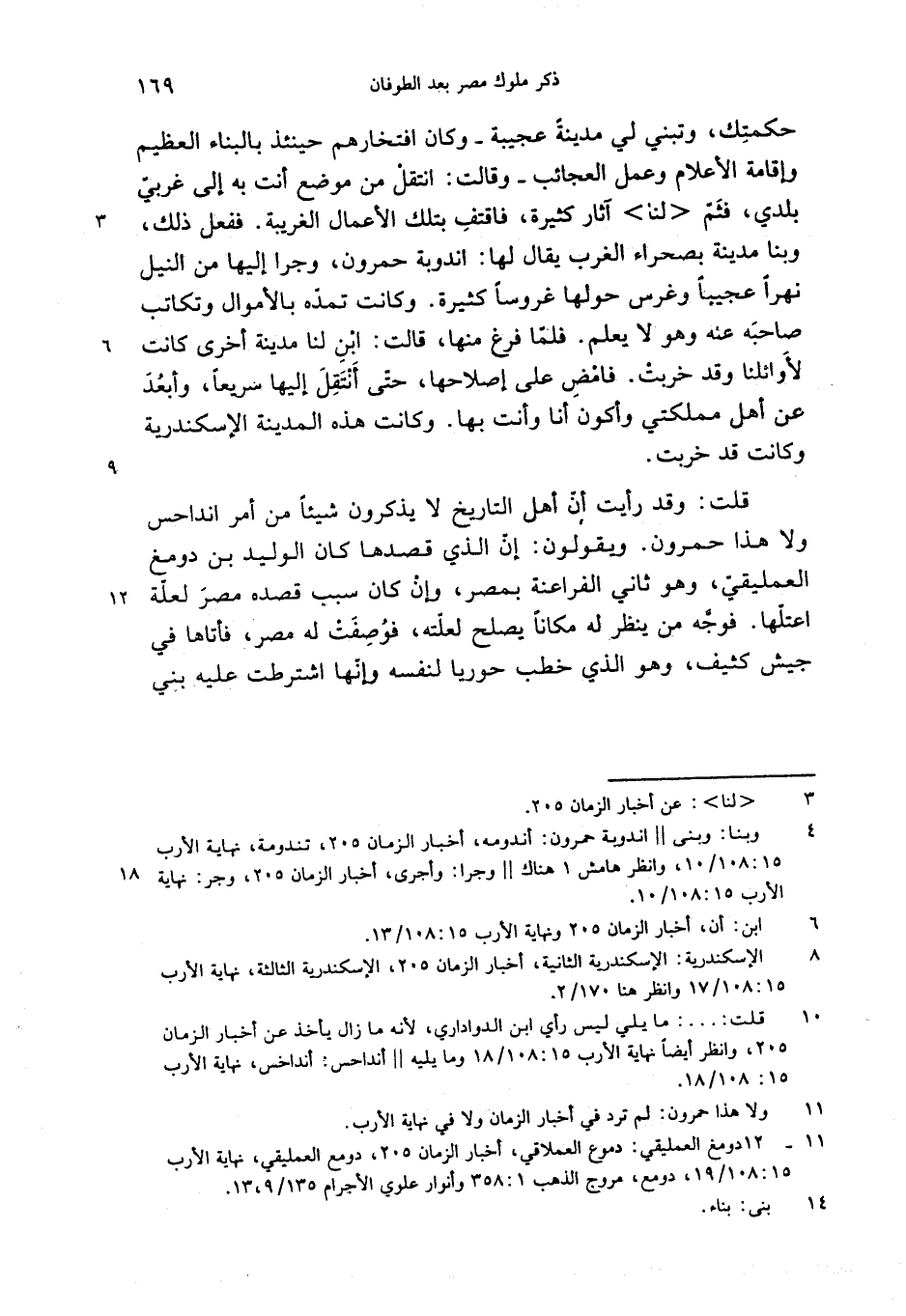 حكمتك، وتبني لي مدينة عجيبة-وكان افتخارهم حينئذ بالبناء العظيم وإقامة الأعلام وعمل العجائب-وقالت: انتقل من موضع أنت به إلى غربيّ بلدي، فثمّ <لنا> آثار كثيرة، فاقتف بتلك الأعمال الغريبة. ففعل ذلك، وبنا مدينة بصحراء الغرب يقال لها: اندوبة حمرون، وجرا إليها من النيل نهرا عجيبا وغرس حولها غروسا كثيرة. وكانت تمدّه بالأموال وتكاتب صاحبه عنه وهو لا يعلم. فلمّا فرغ منها، قالت: ابن لنا مدينة أخرى كانت لأوائلنا وقد خربت. فامض على إصلاحها، حتّى أنتقل إليها سريعا، وأبعد عن أهل مملكتي وأكون أنا وأنت بها. وكانت هذه المدينة الإسكندرية وكانت قد خربت.