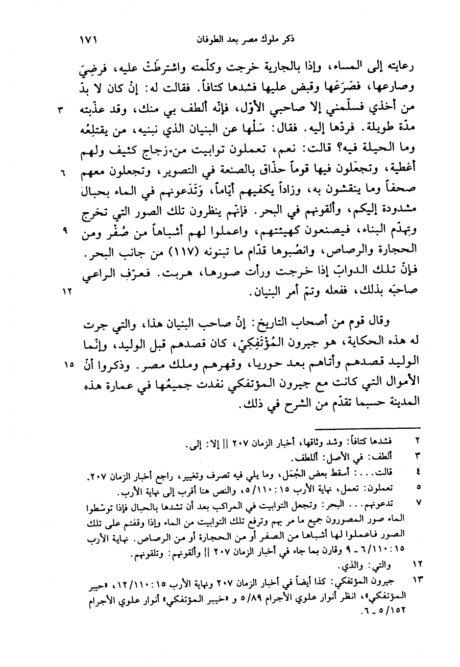 رعايته إلى المساء، وإذا بالجارية خرجت وكلّمته واشترطت عليه، فرضي وصارعها، فصرعها وقبض عليها فشدها كتافا. فقالت له: إن كان لا بدّ من أخذي فسلّمني إلا صاحبي الأوّل، فإنّه ألطف بي منك، وقد عذّبته مدّة طويلة. فردّها إليه. فقال: سلها عن البنيان الذي نبنيه، من يقتلعه وما الحيلة فيه؟ قالت: نعم، تعملون توابيت من زجاج كثيف ولهم أغطية، وتجعلون فيها قوما حذّاق بالصنعة في التصوير، وتجعلون معهم صحفا وما ينقشون به، وزادا يكفيهم أيّاما، وتدعونهم في الماء بحبال مشدودة إليكم، وألقونهم في البحر. فإنّهم ينظرون تلك الصور التي تخرج وتهدّم البناء، فيصنعون كهيئتهم، واعملوا لهم أشباها من صفر ومن الحجارة والرصاص، وانصبوها قدّام ما تبنونه (117) من جانب البحر.