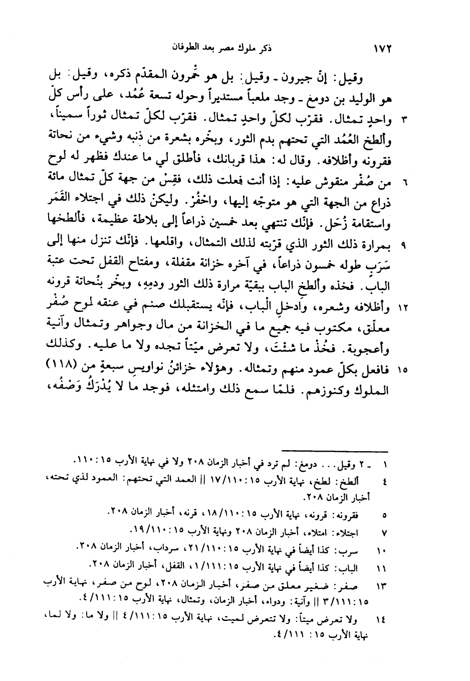 وقيل: إنّ جيرون-وقيل: بل هو حمرون المقدّم ذكره، وقيل: بل هو الوليد بن دومغ-وجد ملعبا مستديرا وحوله تسعة عمد، على رأس كلّ واحد تمثال. فقرّب لكلّ واحد تمثال. فقرّب لكلّ تمثال ثورا سمينا، وألطخ العمد التي تحتهم بدم الثور، وبخّره بشعرة من ذنبه وشيء من نحاتة فقرونه وأظلافه. وقال له: هذا قربانك، فأطلق لي ما عندك فظهر له لوح من صفر منقوش عليه: إذا أنت فعلت ذلك، فقس من جهة كلّ تمثال مائة ذراع من الجهة التي هو متوجّه إليها، واحفر. وليكن ذلك في اجتلاء القمر واستقامة زحل. فإنّك تنتهي بعد خمسين ذراعا إلى بلاطة عظيمة، فألطخها بمرارة ذلك الثور الذي قرّبته لذلك التمثال، واقلعها. فإنّك تنزل منها إلى سرب طوله خمسون ذراعا، في آخره خزانة مقفلة، ومفتاح القفل تحت عتبة الباب. فخذه وألطخ الباب ببقيّة مرارة ذلك الثور ودمه، وبخّر بنحاتة قرونه وأظلافه وشعره، وادخل الباب، فإنّه يستقبلك صنم في عنقه لوح صفر معلّق، مكتوب فيه جميع ما في الخزانة من مال وجواهر وتمثال وآنية وأعجوبة. فخذ ما شئت، ولا تعرض ميّتا تجده ولا ما عليه. وكذلك فافعل بكلّ عمود منهم وتمثاله. وهؤلاء خزائن نواويس سبعة من (118) الملوك وكنوزهم. فلمّا سمع ذلك وامتثله، فوجد ما لا يدرك وصفه،