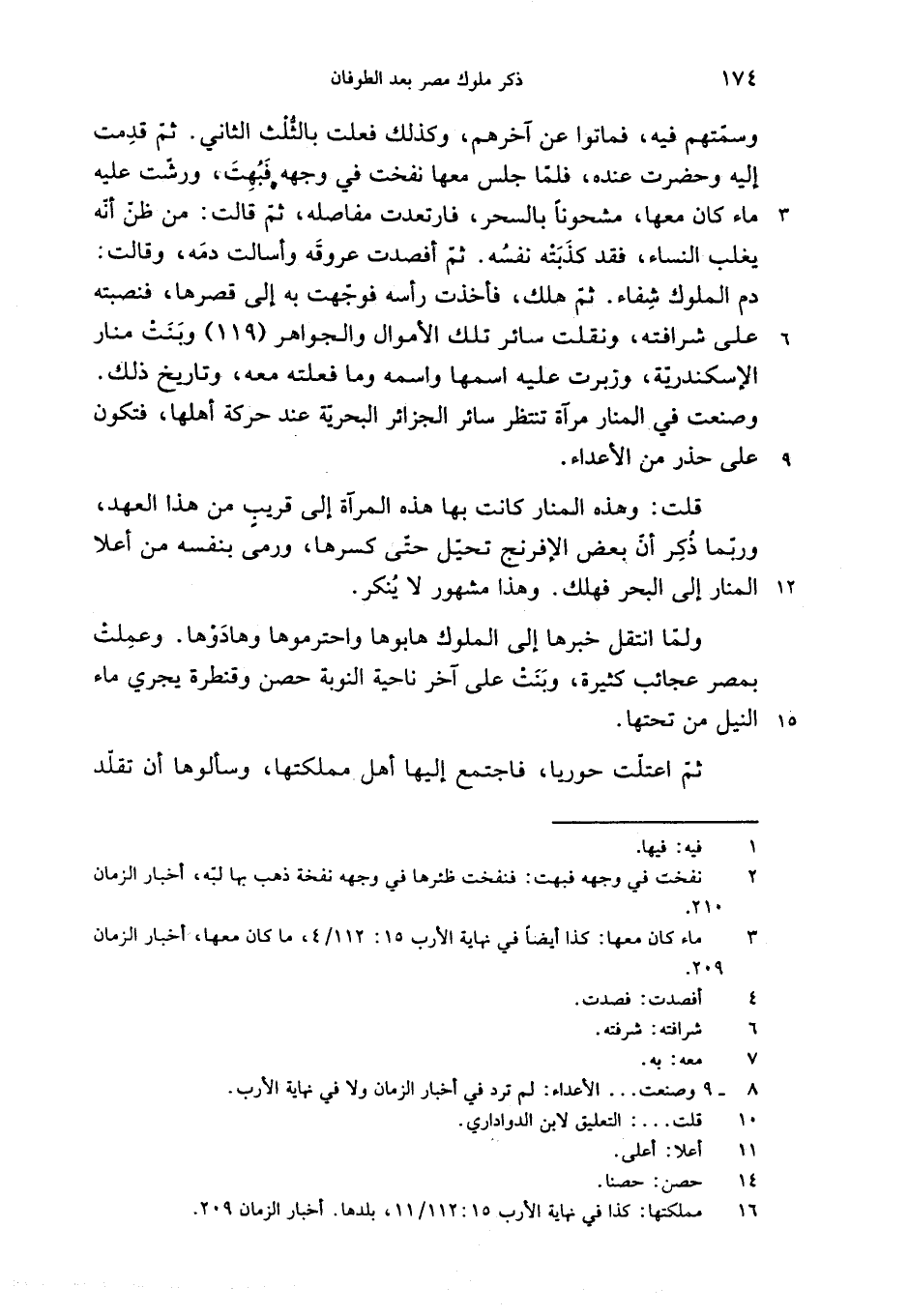 دم الملوك شفاء. ثمّ هلك، فأخذت رأسه فوجّهت به إلى قصرها، فنصبته على شرافته، ونقلت سائر تلك الأموال والجواهر (119) وبنت منار الإسكندريّة، وزبرت عليه اسمها واسمه وما فعلته معه، وتاريخ ذلك.