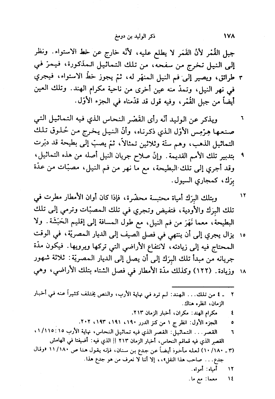 جبل القمر لأنّ القمر لا يطلع عليه، لأنّه خارج عن خط الاستواء. ونظر إلى النيل تخرج من سفحه، من تلك التماثيل المذكورة، فيمرّ في طرائق، ويصير إلى فم النيل المنهّر له، ثمّ يجوز خطّ الاستواء، فيجري في نهر النيل، وتمدّ منه عين أخرى من ناحية مكرام الهند. وتلك العين أيضا من جبل القمر، وفيه قول قد قدّمناه في الجزء الأوّل.