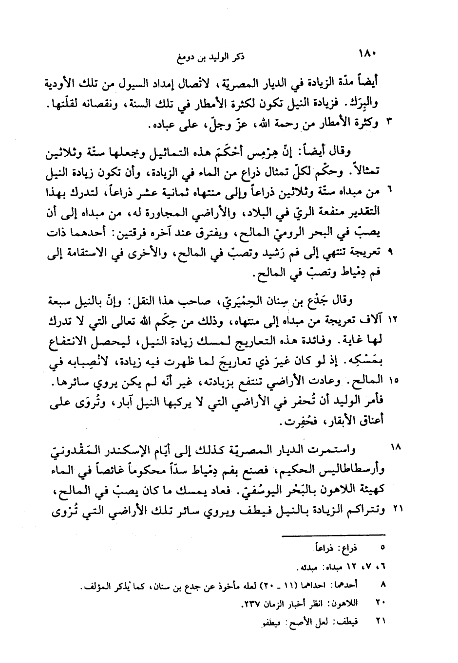 وقال أيضا: إنّ هرمس أحكم هذه التماثيل وجعلها ستّة وثلاثين تمثالا. وحكّم لكلّ تمثال ذراع من الماء في الزيادة، وأن تكون زيادة النيل من مبداه ستّة وثلاثين ذراعا وإلى منتهاه ثمانية عشر ذراعا، لتدرك بهذا التقدير منفعة الريّ في البلاد، والأراضي المجاورة له، من مبداه إلى أن يصبّ في البحر الروميّ المالح، ويفترق عند آخره فرقتين: أحدهما ذات تعريجة تنتهي إلى فم رشيد وتصبّ في المالح، والأخرى في الاستقامة إلى فم دمياط وتصبّ في المالح.