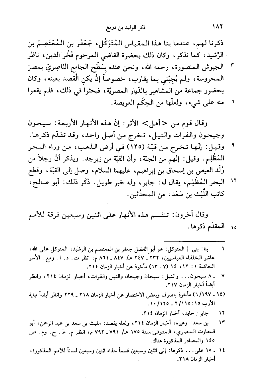 ذكرنا لهم، عندما بنا هذا المقياس المتوكّل، جعفر بن المعتصم بن الرّشيد، كما نذكر، وكان ذلك بحضرة القاضي المرحوم فخر الدين، ناظر الجيوش المنصورة، رحمه الله، ونحن عنده بسطح الجامع النّاصريّ بمصر المحروسة، ولم يجبني بما يقارب، خصوصا إن يكن القصد بعينه، وكان بحضور جماعة من المشاهير بالدّيار المصريّة، فبحثوا في ذلك، فلم يقعوا منه على شيء، ولعلّها من الحكم العويصة.