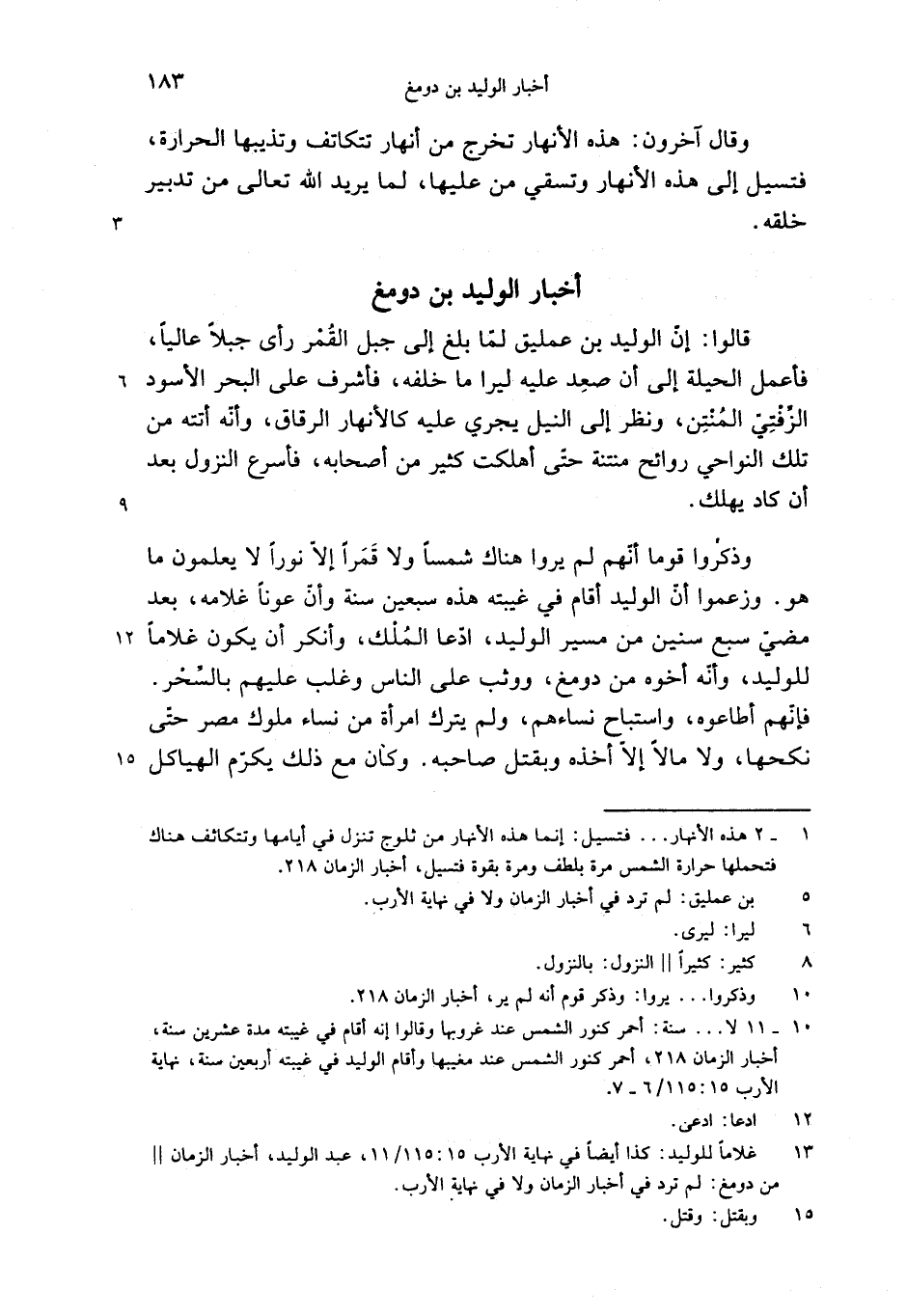 وذكروا قوما أنّهم لم يروا هناك شمسا ولا قمرا إلاّ نورا لا يعلمون ما هو. وزعموا أنّ الوليد أقام في غيبته هذه سبعين سنة وأنّ عونا غلامه، بعد مضيّ سبع سنين من مسير الوليد، ادّعا الملك، وأنكر أن يكون غلاما للوليد، وأنّه أخوه من دومغ، ووثب على الناس وغلب عليهم بالسّحر.