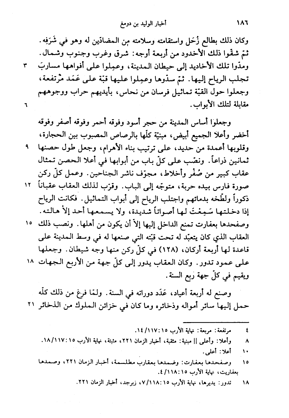 وصفحدها بعفارت تمنع الداخل إليها إلاّ أن يكون من أهلها. ونصب ذلك العقاب الذي كان يتعبّد له تحت قبّته التي صنعها له في وسط المدينة على قاعدة لها أربعة أركان، (128) في كلّ ركن منها وجه شيطان. وجعلها على عمود تدور. وكان العقاب يدور إلى كلّ جهة من الأربع الجهات ويقيم في كلّ جهة ربع السنة.