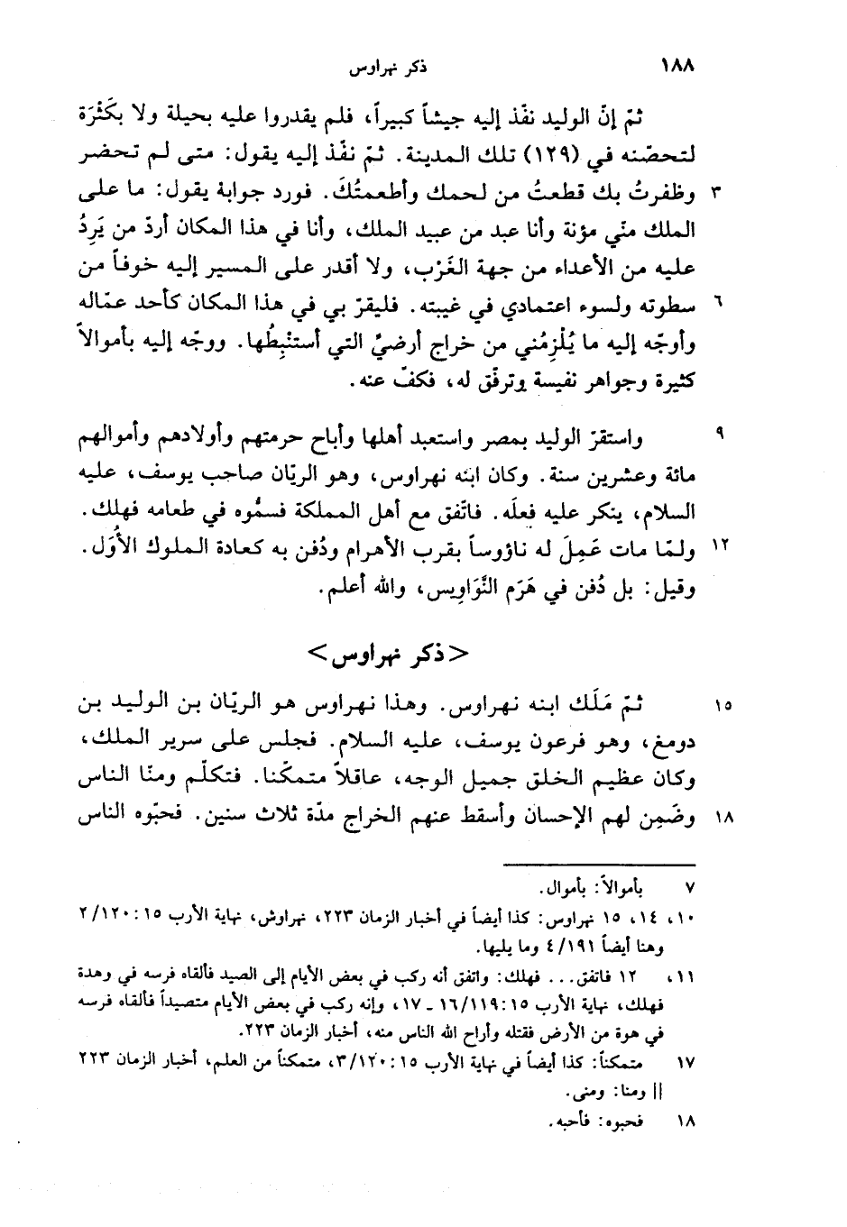 ثمّ ملك ابنه نهراوس. وهذا نهراوس هو الريّان بن الوليد بن دومغ، وهو فرعون يوسف، عليه السلام. فجلس على سرير الملك، وكان عظيم الخلق جميل الوجه، عاقلا متمكّنا. فتكلّم ومنّا الناس وضمن لهم الإحسان وأسقط عنهم الخراج مدّة ثلاث سنين. فحبّوه الناس