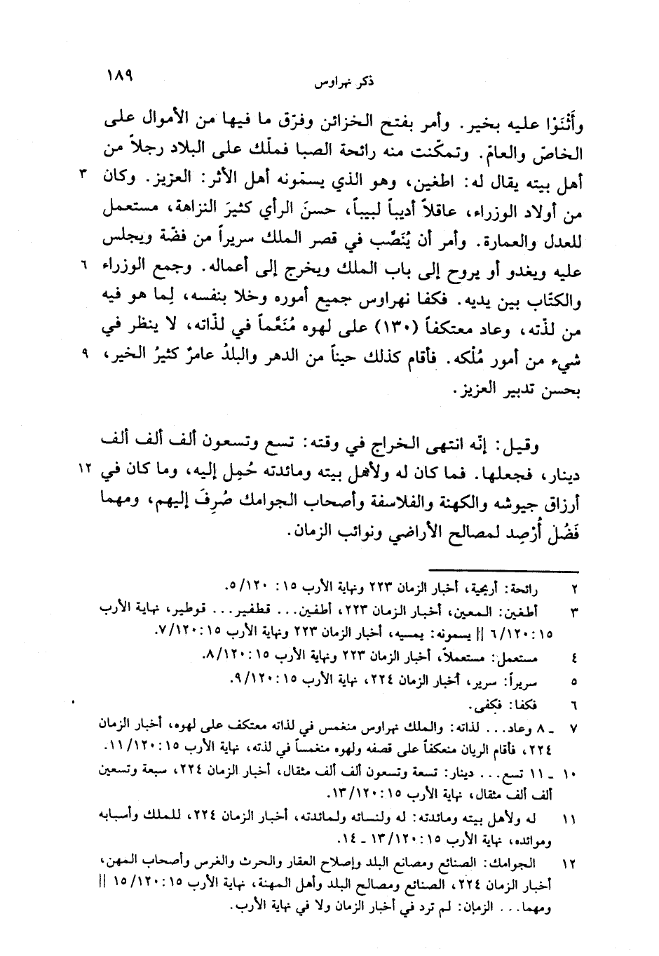 وقيل: إنّه انتهى الخراج في وقته: تسع وتسعون ألف ألف ألف دينار، فجعلها. فما كان له ولأهل بيته ومائدته حمل إليه، وما كان في أرزاق جيوشه والكهنة والفلاسفة وأصحاب الجوامك صرف إليهم، ومهما فضل أرصد لمصالح الأراضي ونوائب الزمان.