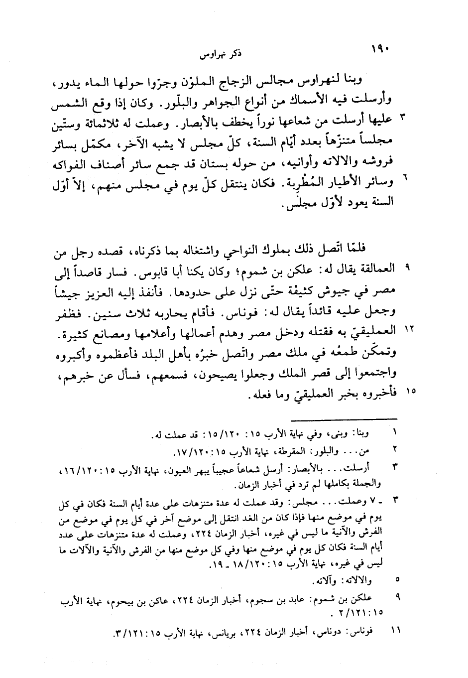 وبنا لنهراوس مجالس الزجاج الملوّن وجرّوا حولها الماء يدور، وأرسلت فيه الأسماك من أنواع الجواهر والبلّور. وكان إذا وقع الشمس عليها أرسلت من شعاعها نورا يخطف بالأبصار. وعملت له ثلاثمائة وستّين مجلسا متنزّها بعدد أيّام السنة، كلّ مجلس لا يشبه الآخر، مكمّل بسائر فروشه والالاته وأوانيه، من حوله بستان قد جمع سائر أصناف الفواكه وسائر الأطيار المطربة. فكان ينتقل كلّ يوم في مجلس منهم، إلاّ أوّل السنة يعود لأوّل مجلس.